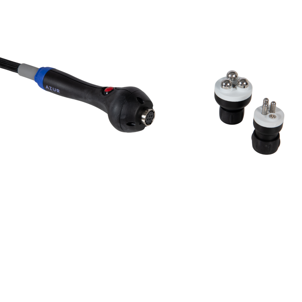 La tecnologia EMS tramite impulsi elettrici selettivi che inducono contrazioni mirate dei muscoli facciali, contribuisce a migliorare tono, circolazione e definizione muscolare mentre, la tecnologia RF converte l’energia elettrica in calore, generando un effetto termico controllato che rimodella il collagene e favorisce la rigenerazione dei tessuti, senza danneggiare l’epidermide. Operando appena al di sopra dello strato muscolare, la tecnologia RF di PRISMA trasferisce l’energia termica direttamente al derma, dove stimola la produzione di collagene ed elastina. Il manipolo AZUR emette separatamente EMS (Elettrostimolazione Muscolare) e RF (Radiofrequenza) per migliorare il tono dei muscoli del viso e stimolare il rassodamento cutaneo, contribuendo a ridurre i segni visibili dell’invecchiamento. È dotato di due tip intercambiabili, una large e una small, progettate per adattarsi con precisione alle diverse aree del viso e ottimizzare l’efficacia del trattamento.